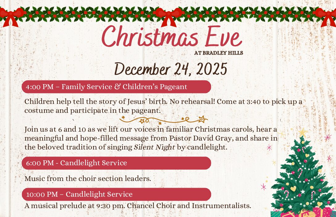 Please join us at 4:00 for a family service and children’s pageant, or at 6:00 and 10:00 for candlelight services.